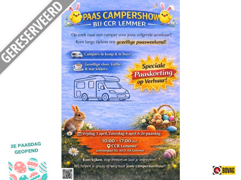 Deze advertentie en de inhoud ervan zijn met de grootste mogelijke zorg samengestelt.Het is echter mogelijk dat de in de gehanteerde advertentietekst bepaalde opties en/of accesoires zijn vermeld die niet op deze specifieke kampeerauto of caravan aanwezig zijn. Er kunnen derhalve geen rechten worden ontleend CCR Lemmer kan nooit aansprakelijk worden gesteld voor de inhoud en volledigheid van de verstrekte informatie.Kilometerstand is afgelezen van de kilometerteller en het rijklaar gewicht is afgelezen van het kentekenbewijs !