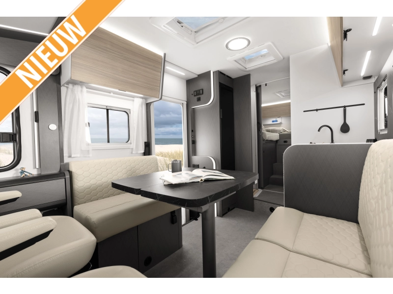 De slimme indeling met enkele bedden, een ruime Face to Face zithoek en een grote garage maakt deze camper perfect voor lange reizen én korte trips. Alles is aanwezig om direct op pad te gaan.