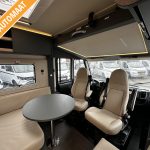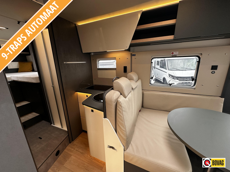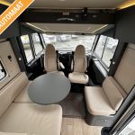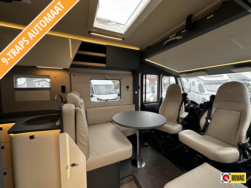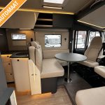 De ruime L-zit met draaibare cabinestoelen biedt plaats aan 4–5 zitplaatsen, 4 rijplaatsen en 4 slaapplaatsen.