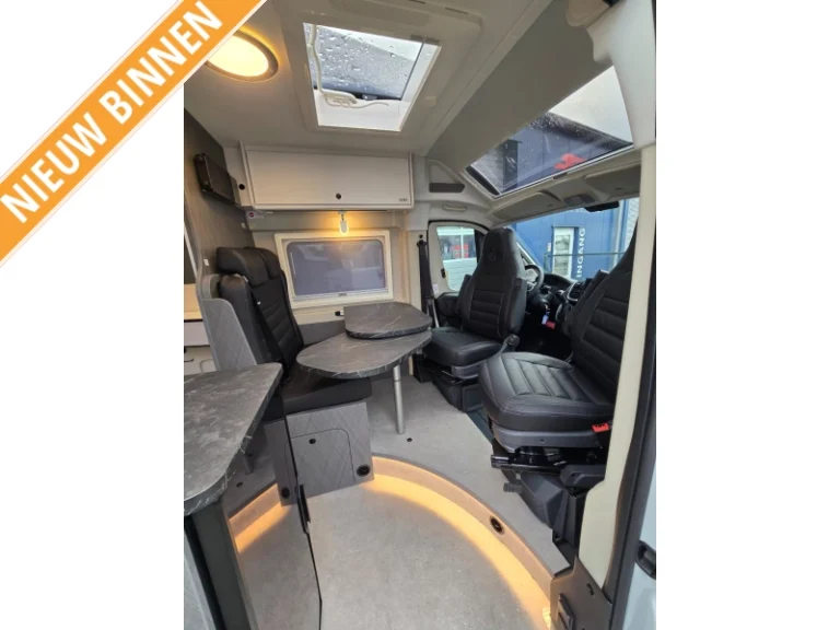 De ruime L-zit met draaibare cabinestoelen biedt plaats aan 4–5 zitplaatsen, 4 rijplaatsen en 4 slaapplaatsen.